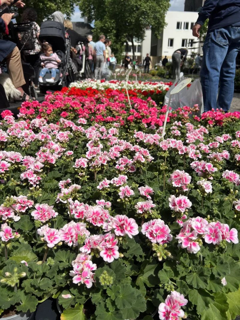 Kleurrijke markt vol bloemen, planten en diverse seizoensproducten